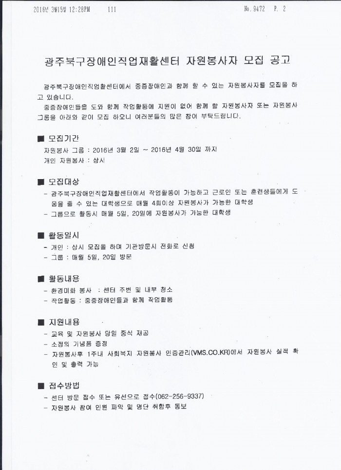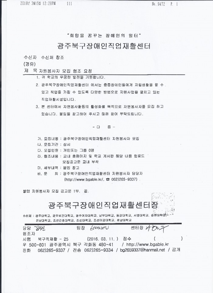 광주북구장애인직업재활센터 자원봉사자 모집 페이지 정보 작성자 관리자 댓글 0건 조회 495회 작성일 16-03-15 16:24 목록 본문 이전글2016 세계사회복지대회 16.03.15 다음글광주광역시 동구 청소년지원센터 (꿈드림) 2016년 '꿈드림 멘토단' 2기 모집 안내 16.03.09 댓글 0 댓글목록 등록된 댓글이 없습니다.