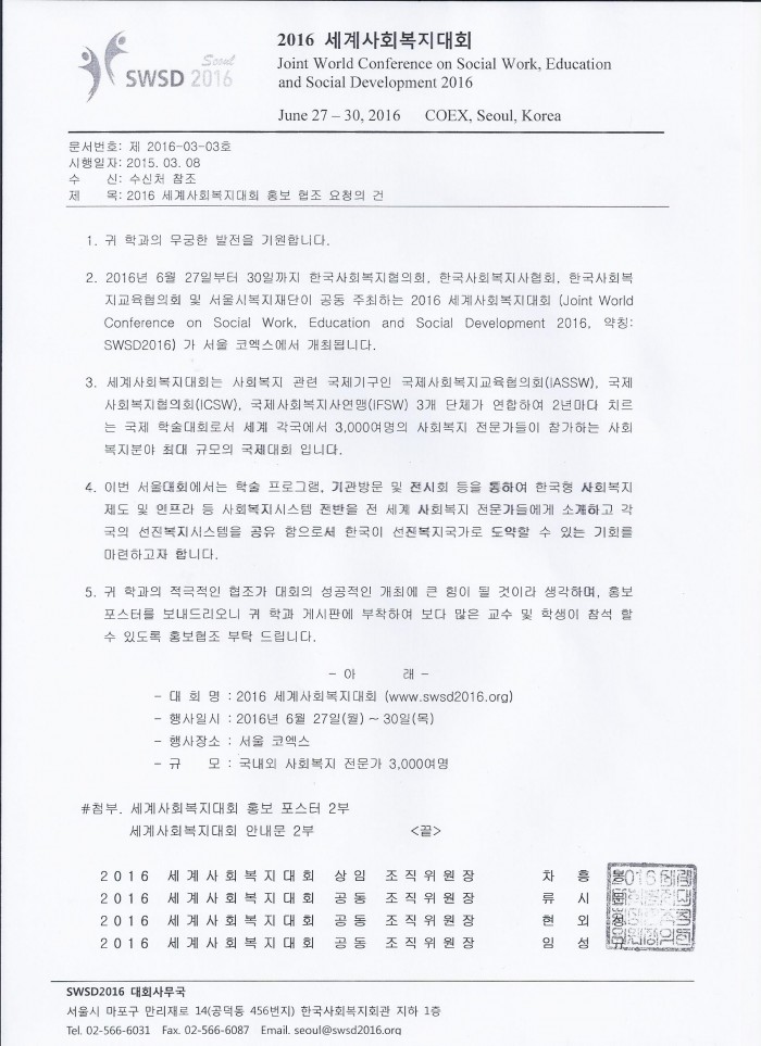 2016 세계사회복지대회 페이지 정보 작성자 관리자 댓글 0건 조회 518회 작성일 16-03-15 16:27 목록 본문 이전글서울아산병원 순회진료서비스에 따른 자원봉사자 모집 16.03.17 다음글광주북구장애인직업재활센터 자원봉사자 모집 16.03.15 댓글 0 댓글목록 등록된 댓글이 없습니다.