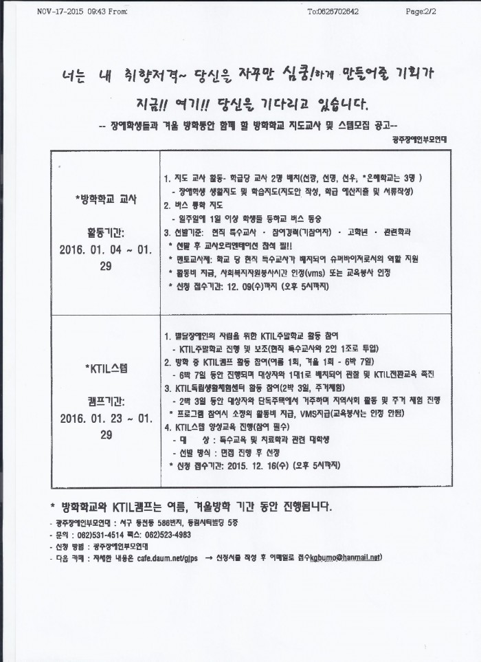 광주장애인부모연대 지도교사 및 스텝모집 안내 페이지 정보 작성자 관리자 댓글 0건 조회 735회 작성일 15-11-23 09:10 목록 본문 자세한 내용은 첨부된 파일을 확인하시기 바랍니다. 이전글광주동구건강가정지원센터 동계 사회복지현장실습생 모집안내 15.12.02 다음글시민복지자문단 100인 원탁회의 개최안내 15.11.17 댓글 0 댓글목록 등록된 댓글이 없습니다.