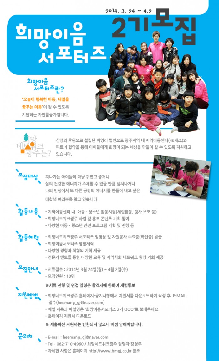 희망이음서포터즈 2기 모집안내 페이지 정보 작성자 김효정 댓글 0건 조회 996회 작성일 14-03-24 17:14 목록 본문 이전글동구청소년수련관에서 동구청소년어울림마당 기획단을 모집합니다. 14.03.26 다음글2014년 1학기 학교사회사업 진행보조 자원봉사자를 모집합니다. 14.03.24 댓글 0 댓글목록 등록된 댓글이 없습니다.
