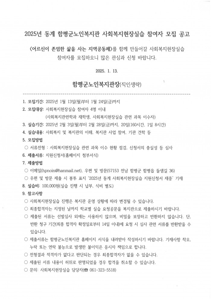 함평군노인복지관 2025년 동계 사회복지현장실습 모집