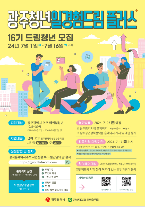 광주광역시에서는 지역의 미취업 청년들이 다양한 일경험을 통해 진로와 직업 비전을 찾을 수 있도록 지원하는 「광주청년 일경험드림플러스 사업」에 참여할 제16기 드림청년(참여청년)을 다음과 같이 공개모집 합니다.