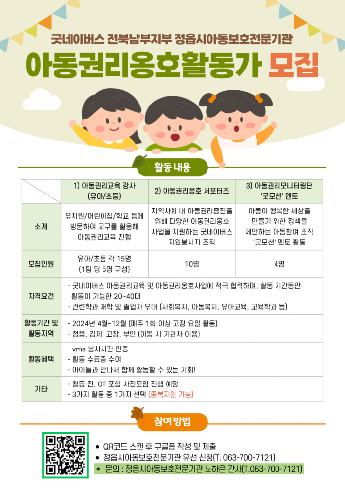 굿네이버스 전북남부지부 아동권리옹호활동가 모집 페이지 정보 작성자 학과관리자 댓글 0건 조회 210회 작성일 24-02-29 14:08 목록 본문 . 이전글2024 대학생 멘토링 동아리 지원사업 24.02.29 다음글<광산구장애인복지관> 자원봉사자 모집 24.02.22 댓글 0 댓글목록 등록된 댓글이 없습니다.