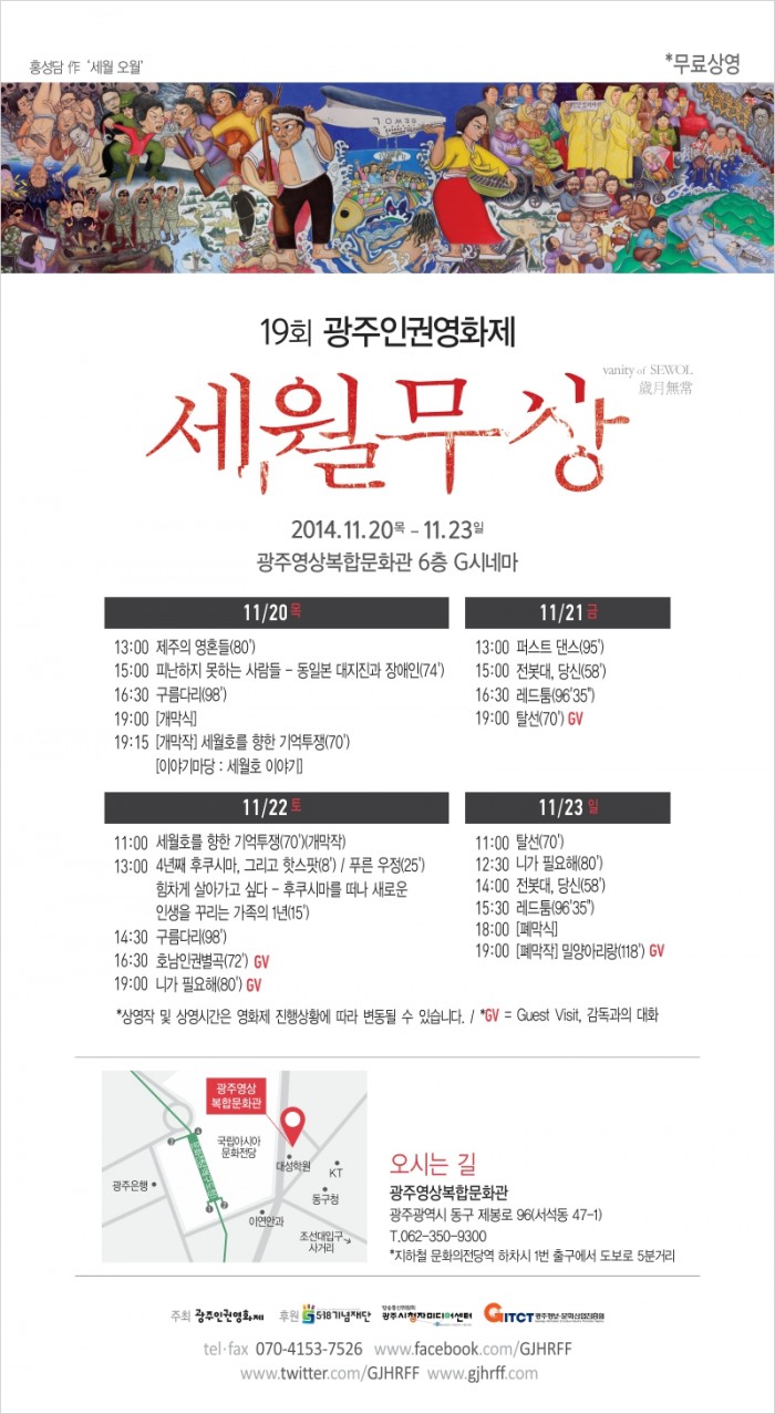 19회 광주인권영화제에 초대합니다. 페이지 정보 작성자 관리자 댓글 0건 조회 581회 작성일 14-11-10 16:41 목록 글쓰기 본문 영화는 무료 상영입니다..!! 많은 관심 부탁드립니다^^ 이전글제19기 대학생을 위한 중독 상담사 초급과정 교육생 모집안내 14.11.11 다음글고령자 복지 플러스 아이디어 공모전 14.10.31 댓글 0 댓글목록 등록된 댓글이 없습니다.