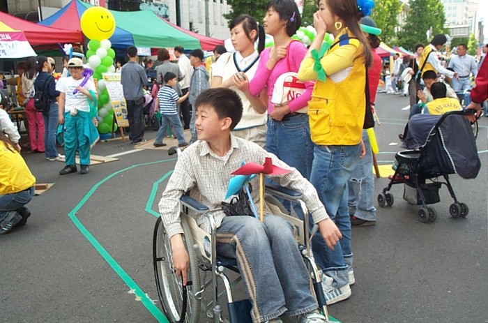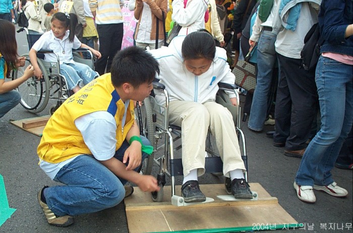 금남로 한가운데에서.. 휠체어 체험을 하고 있는 모습