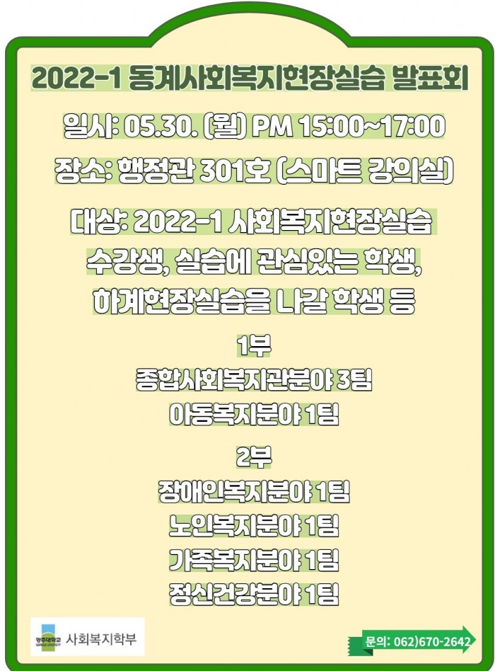 지난 5월 31일(월) 행정관 301호에서 2022-1 동계사회복지현장실습발표회가 개최되었습니다. 교수님들께서 오셔서 독려해주시고 많은 학우님들도 실습에 대한 정보를 얻어가는 유익한 시간이었습니다:)
