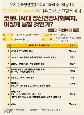 지난 11월 4일 사회복지학부 내 정신건강사회복지 학습동아리 '초심' 주최 2021년도 한국정신건강사회복지학회 추계학술대회 “코로나 정신건강사회복지, 어떻게 응할 것인가?”라는 주제하에 전달 세미나가 개최되었다.
