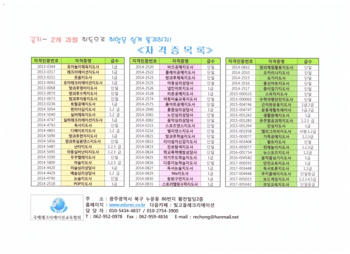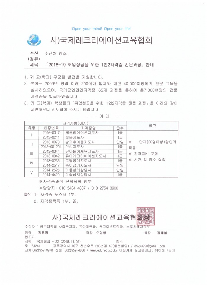 레크레이션 자격 관련 안내 페이지 정보 작성자 학과관리자 댓글 0건 조회 732회 작성일 18-12-03 15:54 목록 본문 문의 010-5434-4837 이전글레크레이션 자격 관련 안내 19.05.30 다음글사회복지현장실습 실습종료 후 제출서류 및 각종 서류 안내 18.09.21 댓글 0 댓글목록 등록된 댓글이 없습니다.