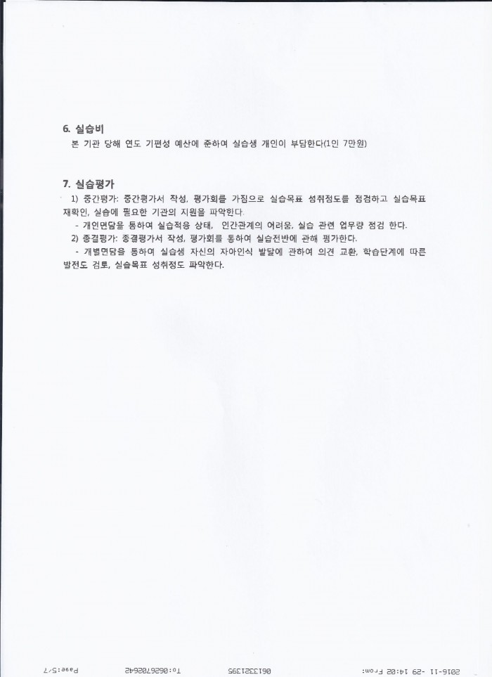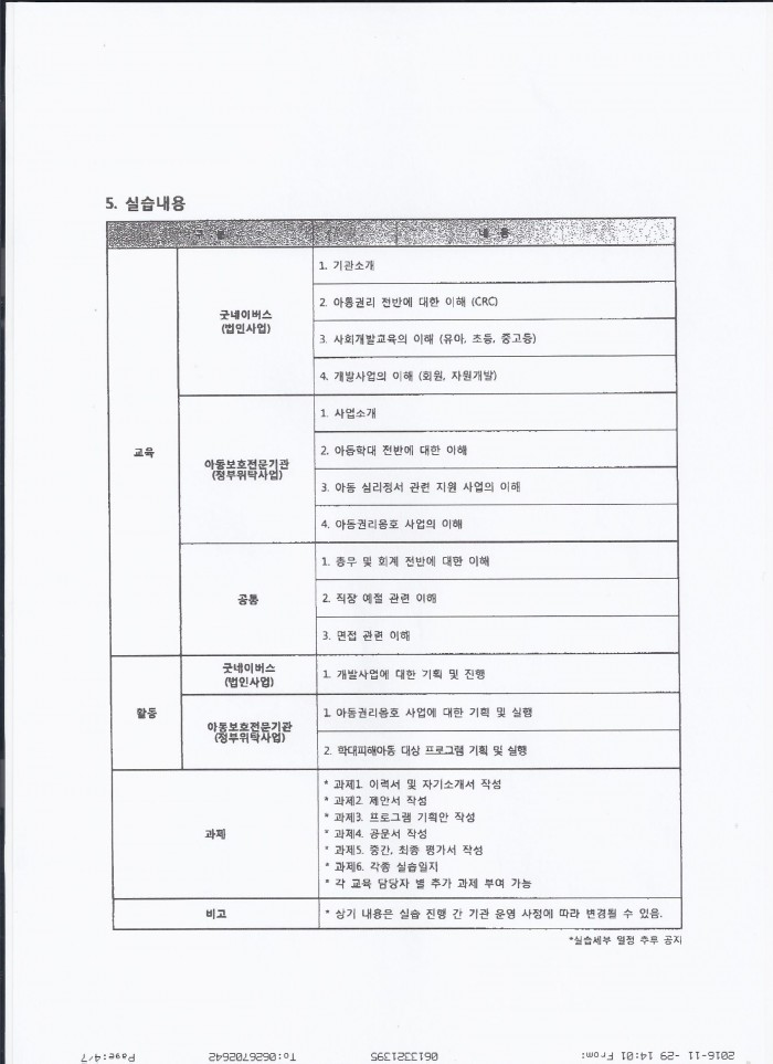 5) 실습내용 : 법인 및 기관의 이해, 사례관리, 프로포절, 심리치료, 사히개발교육 등(세부사항 붙임 참조)