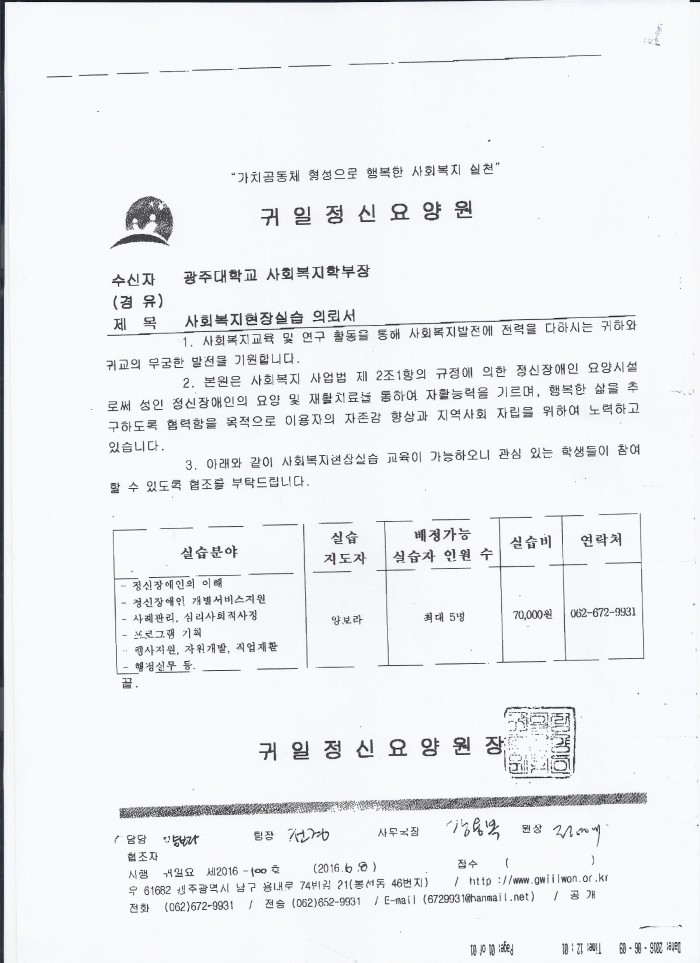 귀일정신요양원-2016 사회복지현장실습생 모집 페이지 정보 작성자 관리자 댓글 0건 조회 721회 작성일 16-06-09 16:56 목록 본문 이전글광주동구건강가정지원센터-2016년 하계 사회복지현장실습생 모집 16.06.15 다음글전라남도장애인종합복지관-2016 사회복지현장 실습생 모집 16.06.09 댓글 0 댓글목록 등록된 댓글이 없습니다.