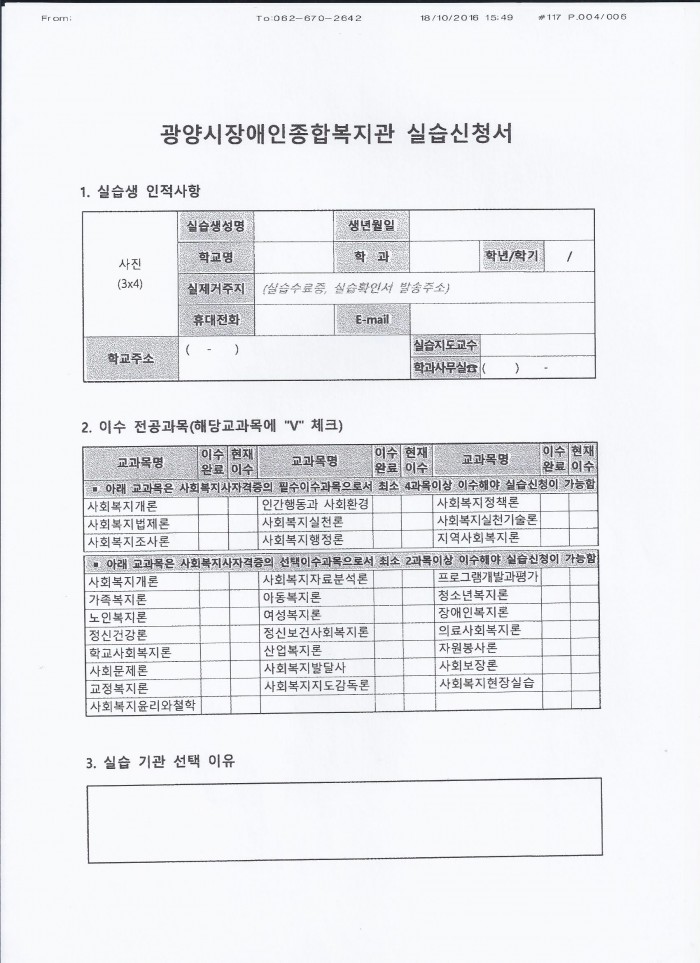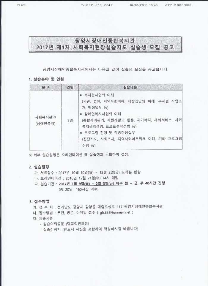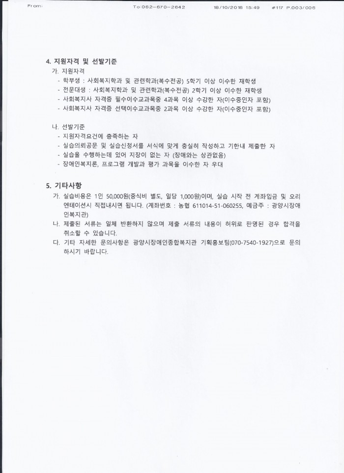 사. 실습관련문의 : 광양시장애인종합복지관 기획홍보팀(070-7540-1927) 끝.