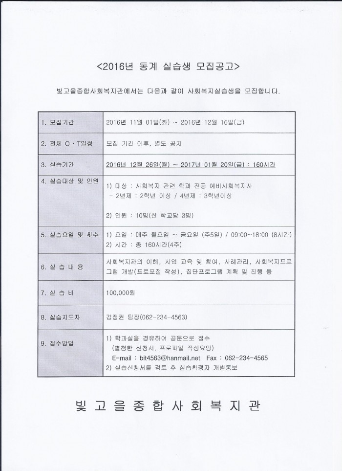 빛고을종합사회복지관 - 2016년 동계 실습생 모집 페이지 정보 작성자 학과관리자 댓글 0건 조회 744회 작성일 16-11-03 13:24 목록 본문 빛고을종합사회복지관에서는 다음과 같이 사회복지실습생을 모집합니다. 이전글(사)우리이웃장애인자립생활센터 - 2016년 하반기 현장실습생 모집 16.11.07 다음글2017년도 제 1차 사회복지현장실습지도 실습생 모집공고 16.10.18 댓글 0 댓글목록 등록된 댓글이 없습니다.
