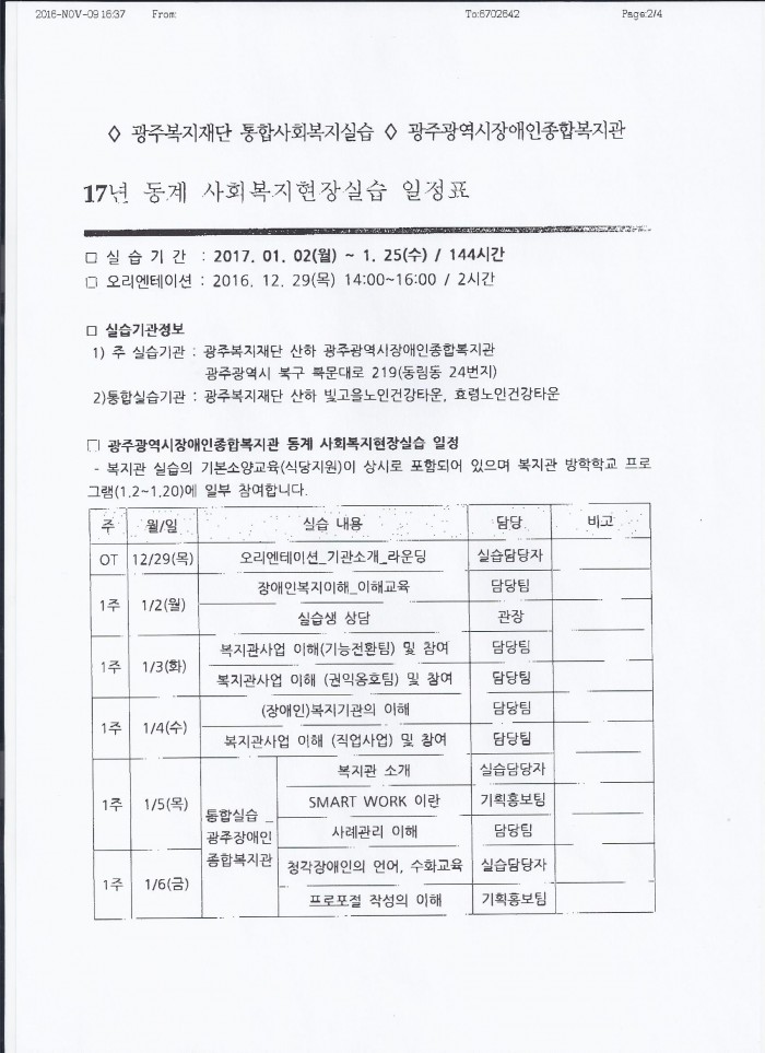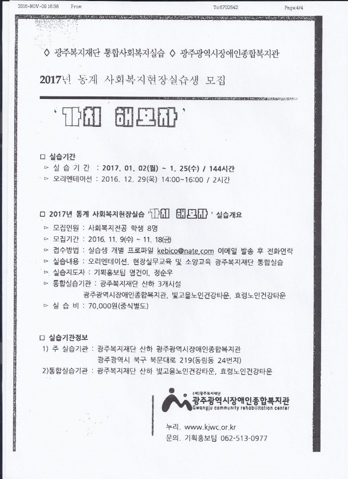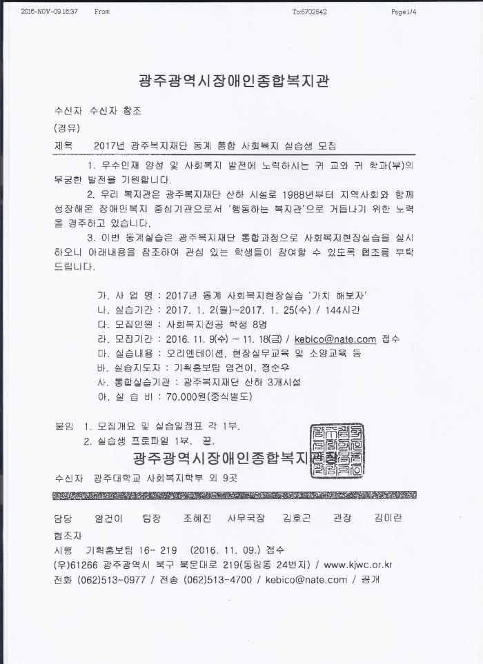 광주광역시장애인종합복지관 - 2017년 광주복지재단 동계 통합 사회복지 실습생 모집 페이지 정보 작성자 학과관리자 댓글 0건 조회 763회 작성일 16-11-09 17:05 목록 본문 이미지 참조 이전글인애종합사회복지관 - 2017년 인애종합사회복지관 동계 사회복지현장실습 안내 16.11.15 다음글(사)우리이웃장애인자립생활센터 - 2016년 하반기 현장실습생 모집 16.11.07 댓글 0 댓글목록 등록된 댓글이 없습니다.