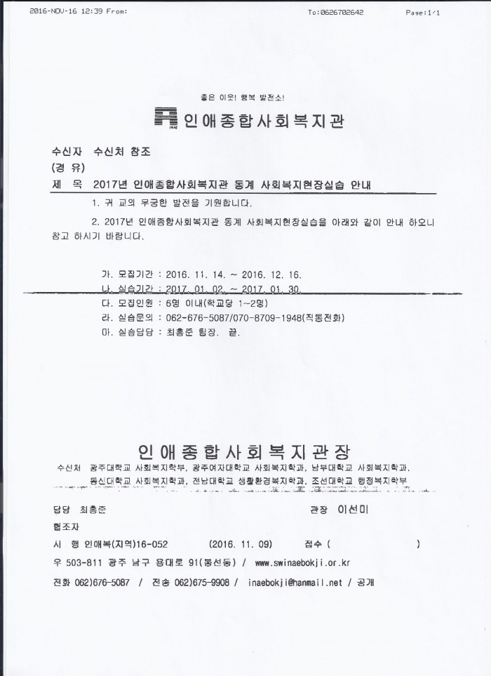 인애종합사회복지관 - 2017년 인애종합사회복지관 동계 사회복지현장실습 안내 페이지 정보 작성자 학과관리자 댓글 0건 조회 742회 작성일 16-11-15 17:05 목록 본문 . 이전글의료법인 인광의료재단 - 2017년도 동계 사회복지현장실습생 모집 16.11.15 다음글광주광역시장애인종합복지관 - 2017년 광주복지재단 동계 통합 사회복지 실습생 모집 16.11.09 댓글 0 댓글목록 등록된 댓글이 없습니다.