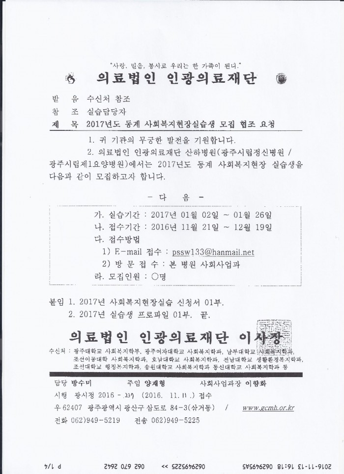 의료법인 인광의료재단 - 2017년도 동계 사회복지현장실습생 모집 페이지 정보 작성자 학과관리자 댓글 0건 조회 775회 작성일 16-11-15 17:09 목록 본문 많은 관심 부탁드리겠습니다. 이전글엠마우스복지관 - 2017년 동계 사회복지실습생 모집 16.11.18 다음글인애종합사회복지관 - 2017년 인애종합사회복지관 동계 사회복지현장실습 안내 16.11.15 댓글 0 댓글목록 등록된 댓글이 없습니다.