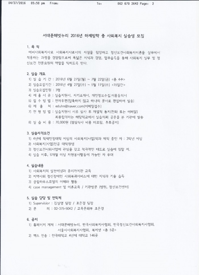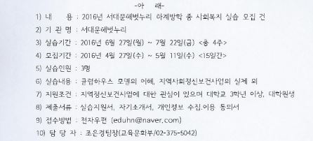 서대문해벗누리-2016 서대문해벗누리 하계방학 중 사회복지 실습 모집 안내 페이지 정보 작성자 관리자 댓글 0건 조회 541회 작성일 16-05-20 13:21 목록 본문 이전글2016년 빛고을종합사회복지관 하계 실습생 모집공고 16.05.23 다음글2016년 하계 사회복지현장실습 모집-광주광역시동구장애인복지관 16.05.20 댓글 0 댓글목록 등록된 댓글이 없습니다.