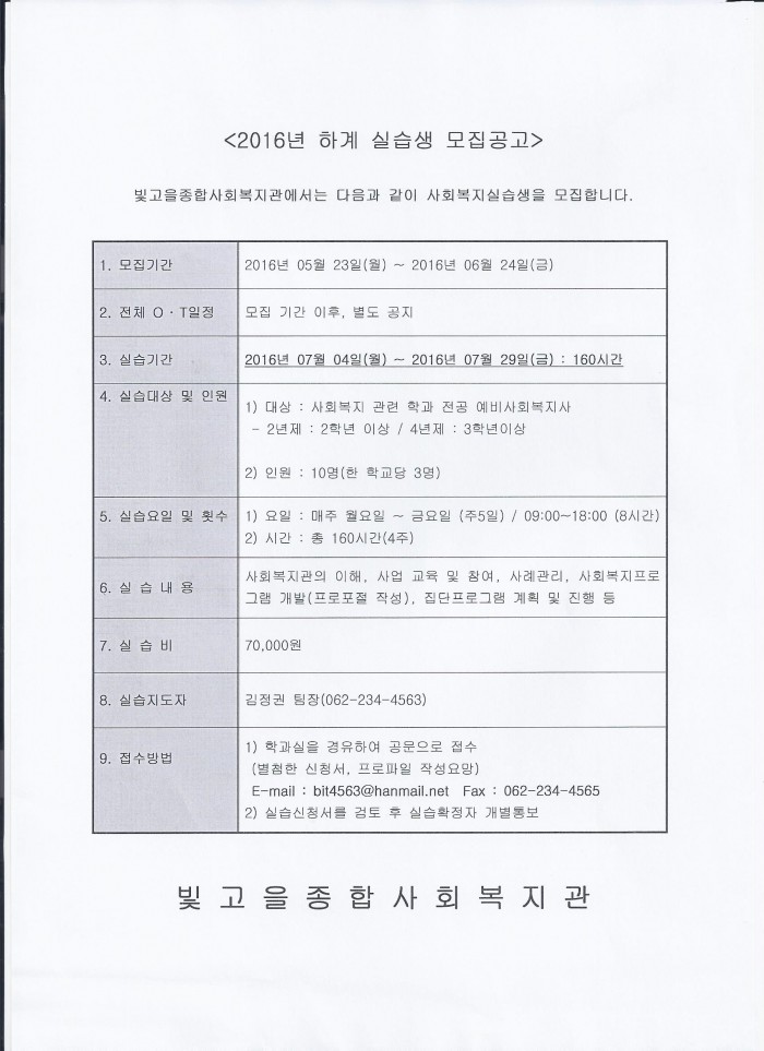 2016년 빛고을종합사회복지관 하계 실습생 모집공고 페이지 정보 작성자 관리자 댓글 0건 조회 552회 작성일 16-05-23 16:56 목록 본문 이전글광주보훈요양원-2016 하계 사회복지 현장실습 참가자 모집 16.05.30 다음글서대문해벗누리-2016 서대문해벗누리 하계방학 중 사회복지 실습 모집 안내 16.05.20 댓글 0 댓글목록 등록된 댓글이 없습니다.