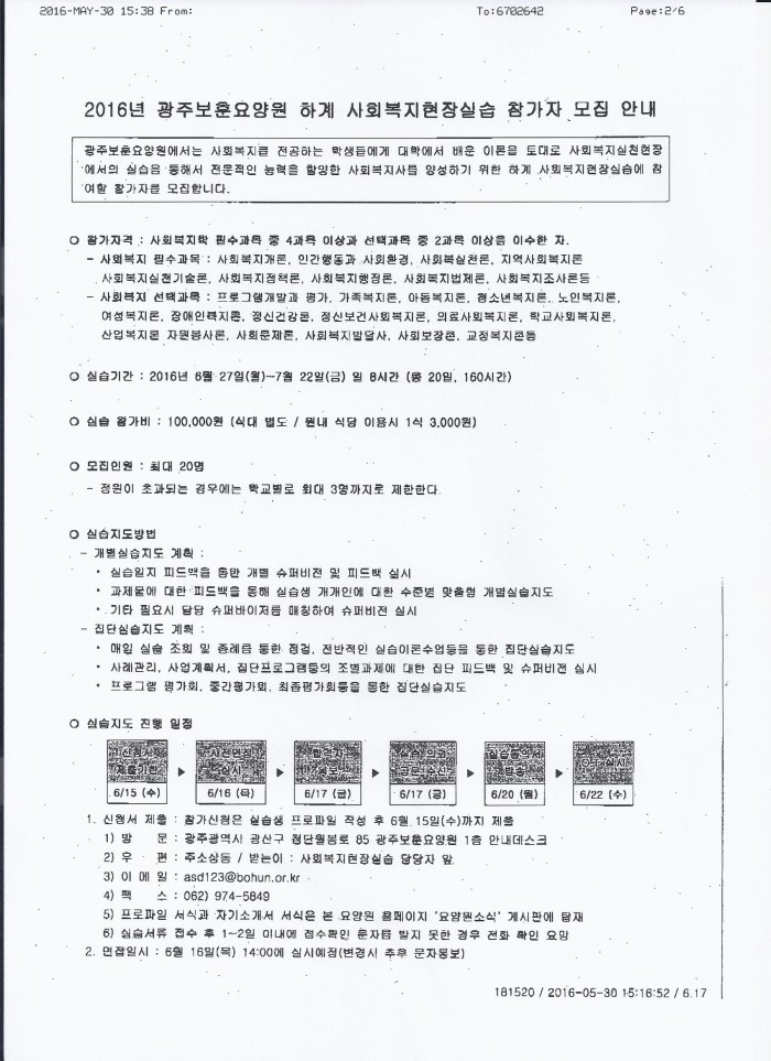 광주보훈요양원-2016 하계 사회복지 현장실습 참가자 모집