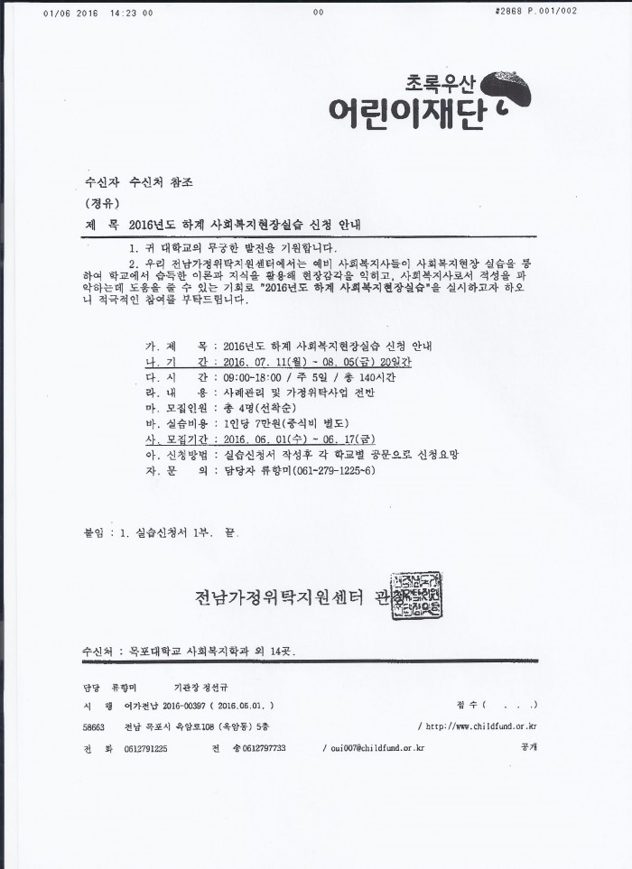 초록우산 어린이재단-2016년도 하계 사회복지현장실습신청 페이지 정보 작성자 관리자 댓글 0건 조회 544회 작성일 16-06-01 15:09 목록 본문 이전글광산구장애인복지관-2016년 하계 사회복지현장실습생모집 16.06.01 다음글방화6종합사회복지관-2016년도 하계 사회복지 현장실습 모집 16.06.01 댓글 0 댓글목록 등록된 댓글이 없습니다.