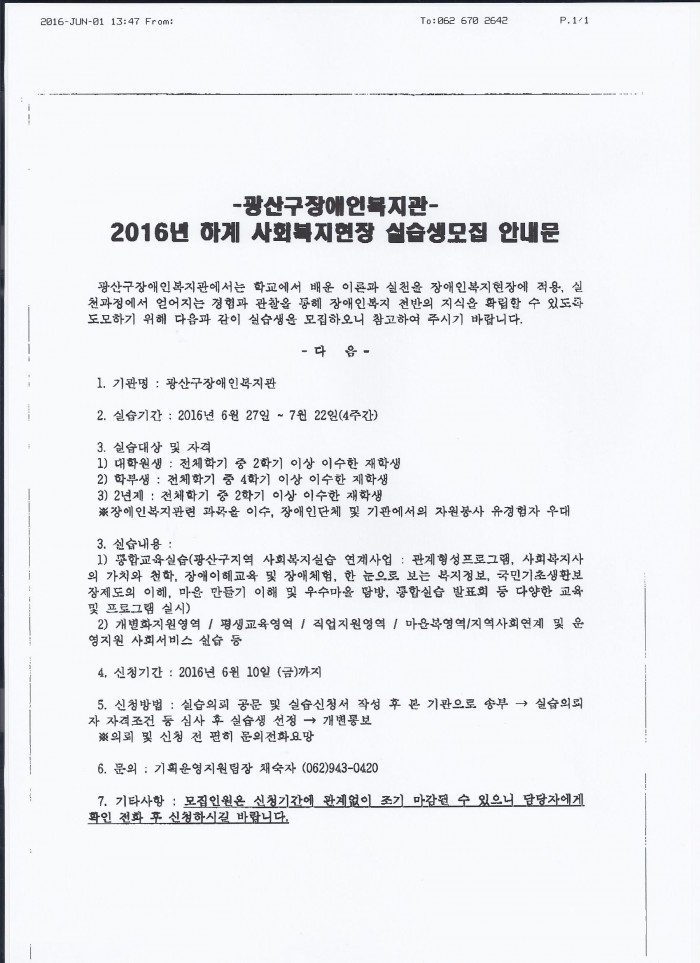 광산구장애인복지관-2016년 하계 사회복지현장실습생모집 페이지 정보 작성자 관리자 댓글 0건 조회 503회 작성일 16-06-01 15:09 목록 본문 이전글나주시노인복지관-2016 하계 사회복지현장실습 안내 및 홍보 16.06.03 다음글초록우산 어린이재단-2016년도 하계 사회복지현장실습신청 16.06.01 댓글 0 댓글목록 등록된 댓글이 없습니다.