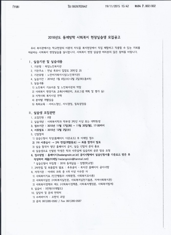 하당노인복지관 동계방학 사회복지 현장실습생 모집안내 페이지 정보 작성자 관리자 댓글 0건 조회 520회 작성일 15-11-23 09:09 목록 본문 자세한 내용은 첨부된 파일을 확인하시기 바랍니다. 이전글상리사회복지관 동계실습생 모집안내 15.11.23 다음글광주북구정신건강증진센터 동계실습생 모집안내 15.11.18 댓글 0 댓글목록 등록된 댓글이 없습니다.