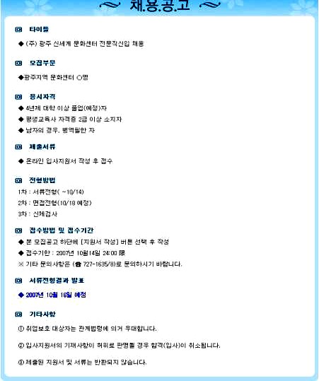 1. 모집분야: 광주 지역 신세계문화센터 전문직 신입 사원(정규직)