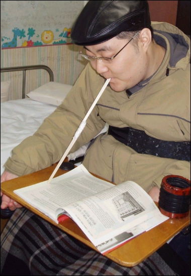 전신마비로 양손과 양발 어느 하나도 움직이지 못하는 1급 장애인이 나무 젓가락 2개를 이어 만든 막대를 입에 물고 책장을 넘기면서 공부해 마침내 대학의 관문을 뚫었다.