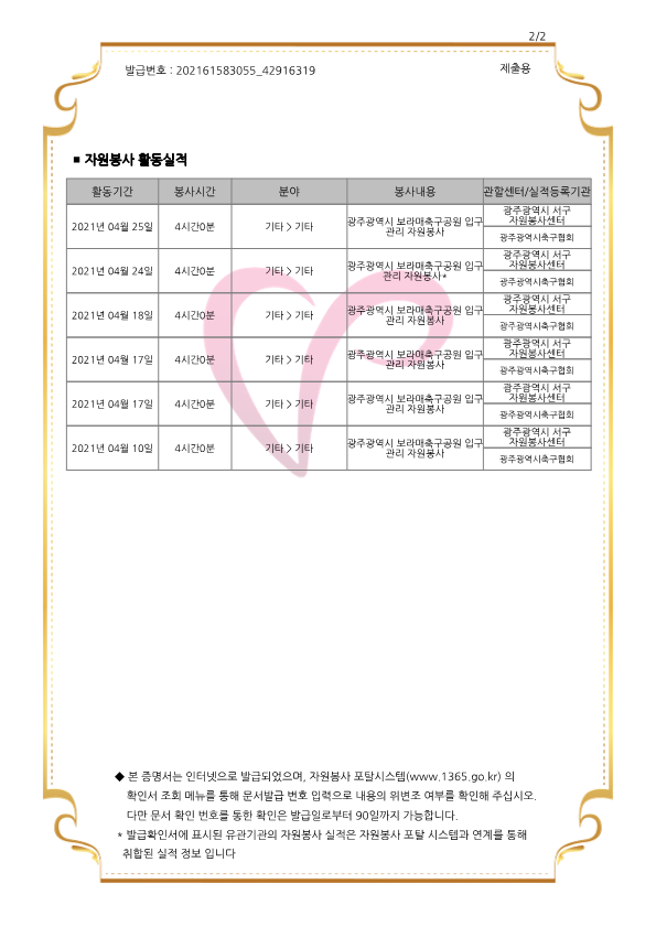 2)봉사활동을 한 시간의 세부 내역 : 보라매축구공원에서 4월 주말마다 4시간씩 합계24시간