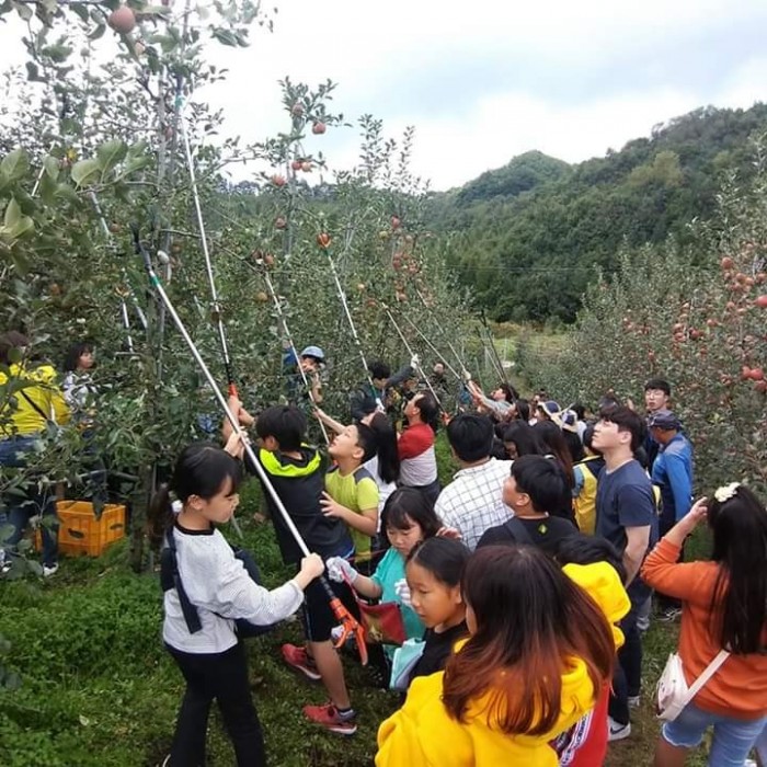 사과농장까지 올라간 후 안전교육을 들었습니다. 사과농장에는 약 300명이 있었습니다. 높은 곳에 사과가 달려있고 도구를 사용해서 사과를 따야 하는데 도구는 넉넉하지 않았습니다. 아이들은 소유욕이 굉장하여 도구를 잘 빌려주지 않아 상황은 매우 혼란스러워졌습니다. 서로 사과를 따겠다며 싸우는 모습에 머리가 지끈거렸습니다. 어쩔 수 없는 어린아이였습니다, 저도 그런 시절이 있기에 그럴 수 있다는 생각을 했지만 하염없이 싸우기만 할 수는 없었습니다. 그래서 극단의 조치를 취하기로 했습니다. 각자 3개씩 따고 도구를 념거주기로 했습니다. 300명이니 3개만 따도 900개라 제가 생각해도 나름 좋은 생각이었다고 느꼈습니다. 그런데 사과를 따기만 했지 그 아무도 사과를 옮길 생각을 하지 않았습니다. 아뿔싸!사과를 옮기는 건 인솔자들 몫이었습니다. 설마 했지만 설마가 사람 잡듯이 저희가 옮기게 되었습니다. 다행히도 사과 농장 사장님께서 전용 트럭을 가져오셔서 한시름 덜었습니다. 하지만 트럭까지 사과를 옮겨야 한다는 건 변함없는 사실이었습니다. 즐기고 난 후 뒤처리를 하는 사람이 있기에 즐길 수 있다는 걸 알았습니다.