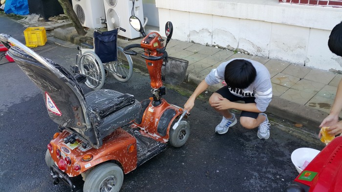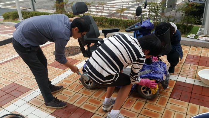 비록 보장구 세척 서비스를 마치면, 많이 피곤하지만 깨끗하게 세척된 전동차와 전동휠체어를 보니 기분이 상쾌했습니다. ‘장애인권감수성교육’, ‘취업하잡 자조모임’, ‘무장애마을만들기(문턱낮추기사업)’은 야외적인 활동이랑 복지관 내에서 하는 업무 보조 활동은 해봤지만, ‘보장구 세척 사업은 야외적인 활동이지만, 마음이 뿌뜻한 자원봉사였습니다.