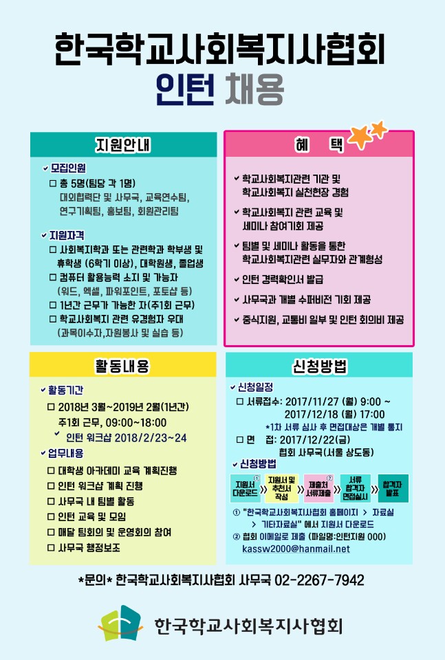 - 지원서 다운로드: 한국학교사회복지사협회 홈페이지 자료실- 기타자료- 2018 협회 사무국 인턴 지원서 및 추천서(선택)