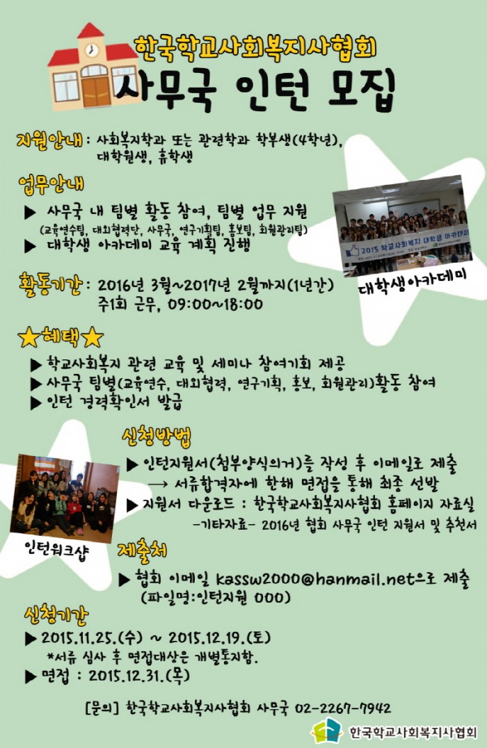 [한국학교사회복지사협회] 2016 사무국 6기 인턴 모집 페이지 정보 작성자 관리자 댓글 0건 조회 670회 작성일 15-12-02 18:23 목록 본문 이전글전남복지재단 직원(사무직) 채용 공고 15.12.17 다음글고흥군 장애인복지관 채용 공고 15.12.02 댓글 0 댓글목록 등록된 댓글이 없습니다.